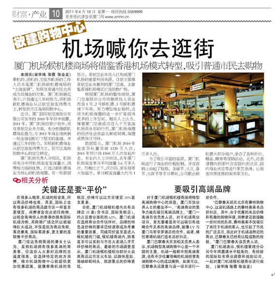 《厦门晚报》4月18日第10版  厦门机场候机楼商场将借鉴香港机场模式转型,吸引普通市民去购物 本报讯(翁华鸿 张蓓 张金龙)乘机的、送机的、空姐和机场的工作人员本是厦门机场候机楼商场的“主流客群”,但现在普通市民也将成为其掘金的对象。厦门机场新近表示,计划通过几年的努力,将机场候机楼商业从以航空旅客消费为主,转型到市区高端购物中心。 近日,厦门国际航空港股份有限公司发布的2010年年报中披露,2011年,厦门机场经营计划中,将在非航空业务方面,充分挖掘候机楼商业潜力,为2012年商业地块新一轮全面招标打下坚实的基础。并通过几年的努力,实现候机楼商业从航空旅客消费为主,到市区高端购物中心的定位转变。 厦门机场负责人介绍说,机场将充分利用机场旅客客流量大、消费能力强的优势,打造以候机楼商业为核心的机场商圈。有一组数据显示,非航空业务收入已构成厦门机场的重要利润来源。目前主要靠非航空业务赢利的厦门空港,正借鉴香港机场模式打造购物广场。 根据厦门机场的整体规划,厦门空港股份公司将继续投入资金改造1号、2号候机楼、3号候机楼地下车库,努力增加商业面积,这将为机场商圈的进一步扩张提供更多的上升空间。相关人士认为,随着厦门空港成功迈入千万客流机场俱乐部的行列,厦门机场商圈的经济社会效益也渐成规模,商圈成熟指日可待。 数据显示,厦门机场2010年旅客吞吐量突破1320万人次,2011年预计向1500万人次发起冲击。有业内人士分析说,去年厦门机场旅客单日平均流量3.6万多人次。而相比之下,沃尔玛、家乐福等大型超市,单日顾客流量大约为1万多人次。 为了吸引丰富的客源,厦门机场进行了商业的价格控制,并在营销上动起了脑筋。圣诞节、元旦、春节、元宵节等节日期间,公司联合候机楼大部分商户,举办了各种折扣、赠品、赠券等促销活动。此外,还邀请楼内的茶叶店在国内到达层、国内商业夹层等进行茶艺表演,让旅客欣赏优雅的闽南茶文化。